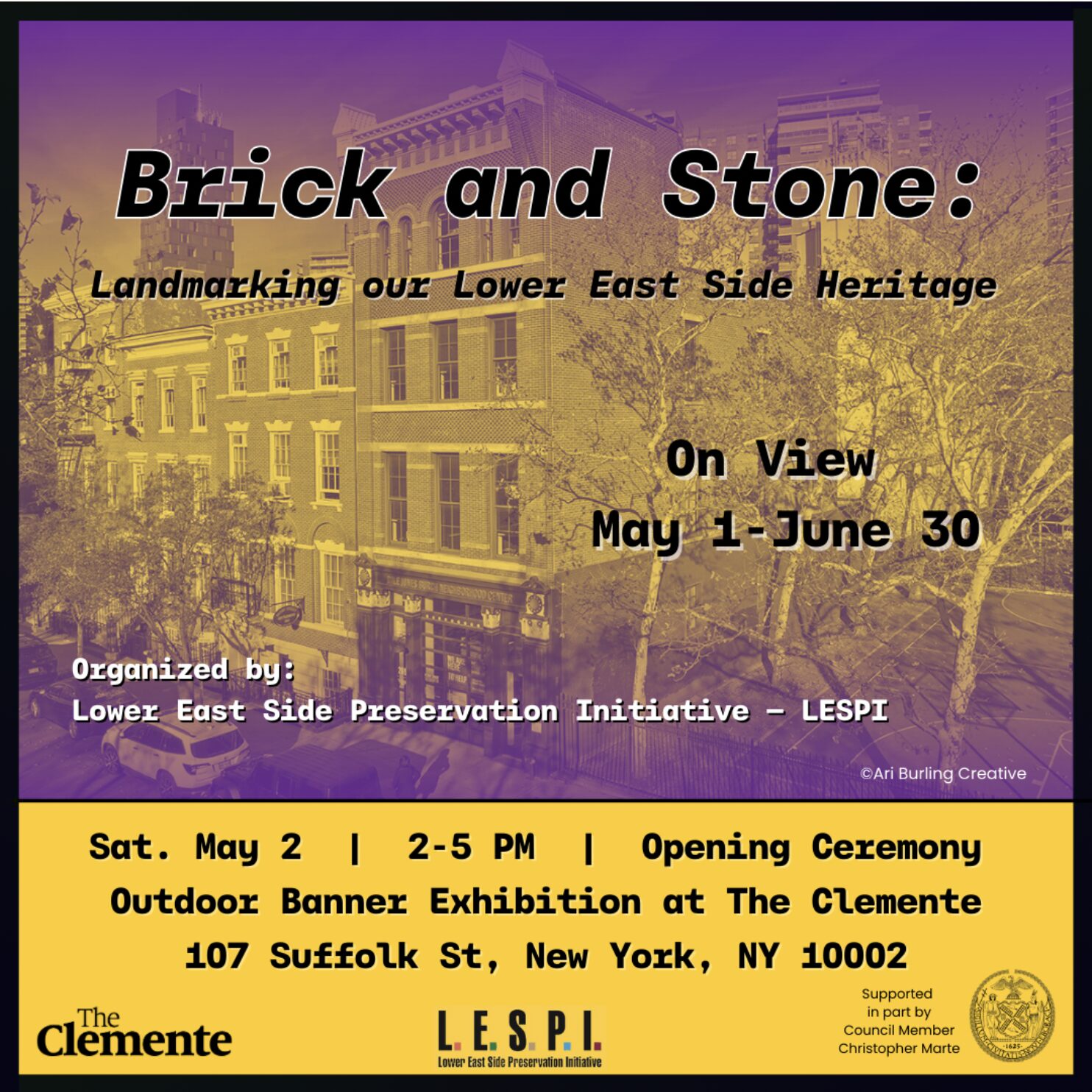 Organized by Lower East Side Preservation Initiative (LESPI) with The Clemente On View: May 1 – June 30 Where: Banner Exhibition on the outdoor Clemente building fence, on the corner […]