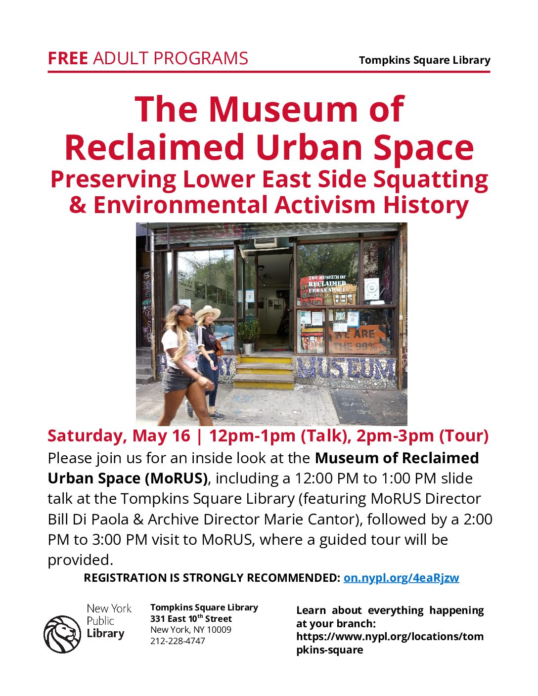 Organized by Tompkins Square Library (NYPL) with the Museum of Reclaimed Urban Space (MoRUS) Please join us for an inside look at the Museum of Reclaimed Urban Space (MoRUS), including a slide talk at the Tompkins Square Library, followed by a visit to MoRUS, where a guided tour will be provided. 12:00 PM to 1:00 […]